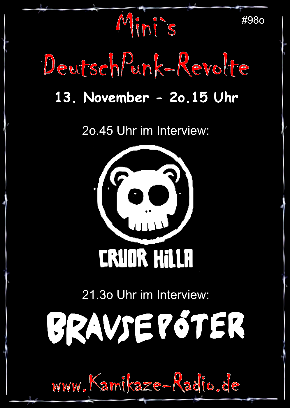 Mini vom Kamikaze-Radio spricht in seiner Sendung Mini`s DeutschPunk-Revolte mit Christian (Vol/Bass), Felix (Git/Vol) und Till (Drums) von Cruor Hilla aus Berlin
