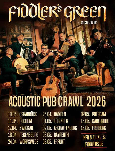 Die Akustiktour zum 35. Jubiläum von Fiddler’s Green! Seit 35 Jahren bringen Fiddler’s Green mit ihrem „Irish Speedfolk“ die Säle zum Kochen. Zum Jubiläum überraschen die Folkrocker ihre Fans mit einer ganz besonderen Tour: dem Acoustic Pub Crawl 2026.