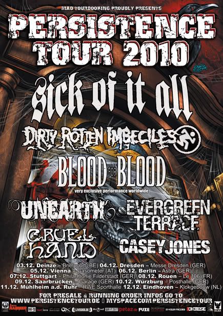 Alle Jahre wieder wartet die Persistence Tour mit großen Namen auf. Einer davon hat für dieses Jahr nach ersten Positivmeldungen wieder abgesagt. Statt Sepultura sind jetzt die Dirty Rotten Imbeciles mit an Bord um neben den bisher bestätigten Sick Of It All, Blood For Blood, Unearth, Evergreen Terrace und der Straight-Edge Band Casey Jones die Hütten zu rocken. Die vorläufigen Tourdaten lauten: