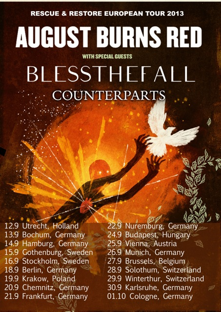 AUGUST BURNS RED werden zusammen mit BLESSTHEFALL eine ausgedehnte - Europa - Tour spielen, mit dabei sind zudem die Counterparts.