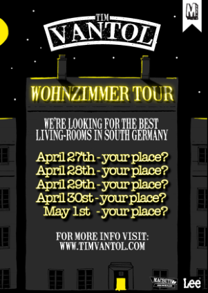 Für fünf exklusive, intime Wohnzimmerkonzerte kommt TIM VANTOL Ende April nach Süddeutschland. Wo er genau spielt? Das kann ab sofort jeder Fan mitentscheiden, indem er sich mit seinem eigenen Wohnzimmer bewirbt. Die Bedingung: Die vier Wände des Interessenten befinden sich in eine der festgelegten Regionen.