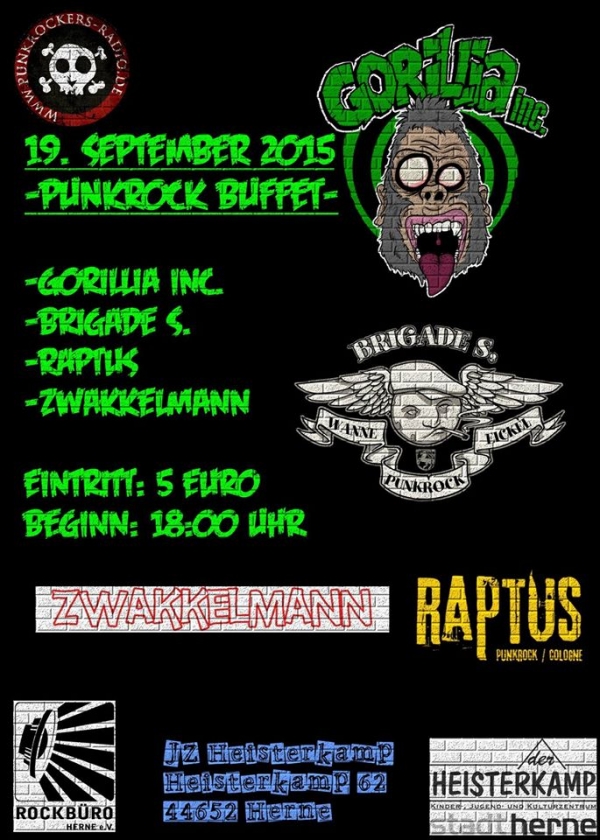 Am 19. September gibt es für schmale 5 EUR im JZ Heisterkamp in Herne ein Punkrock Buffet mit Gorillia Inc., Brigade S, Raptus Punkrock Cologne und Zwakkelmann.